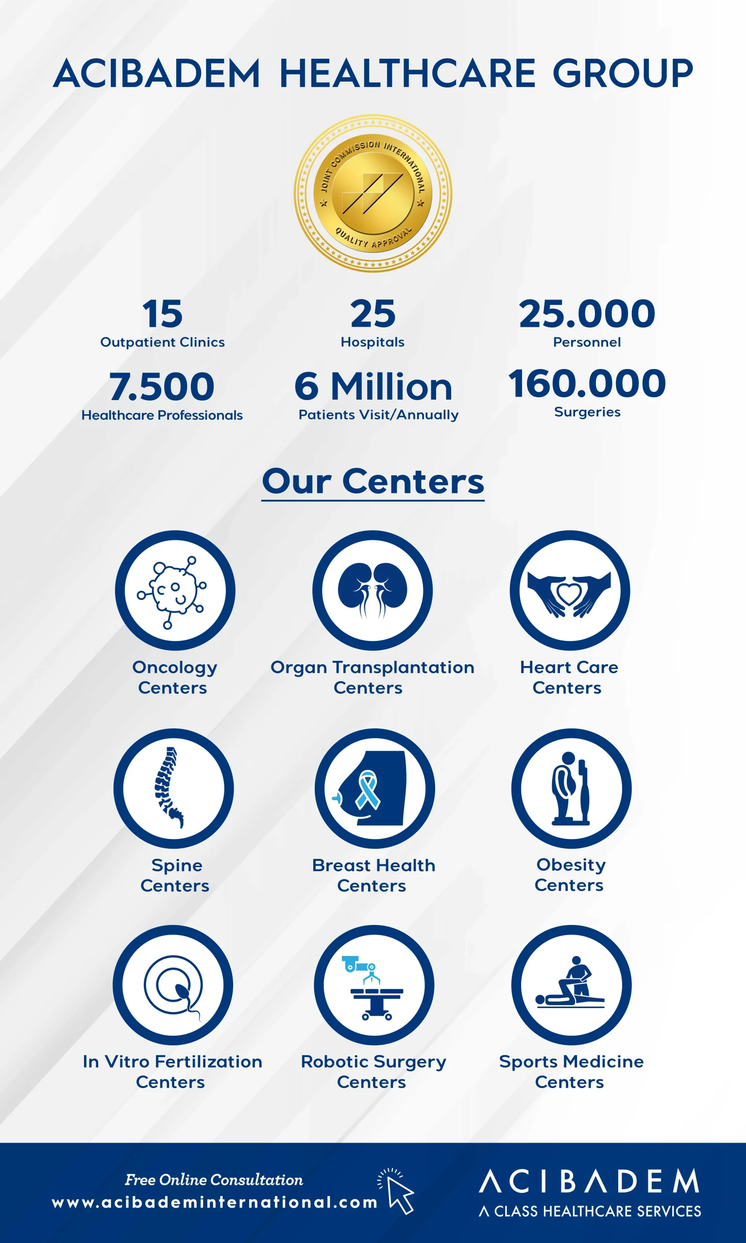 Being one of the most significant international healthcare providers for years with 29 hospitals, 15 outpatient clinics, and over 25.000 healthcare staff; Acıbadem continues its reputation worldwide. The medical facilities in Turkiye, Bulgaria, North Macedonia, Serbia, and the Netherlands proudly continue serving its patients. In addition to these, Acıbadem operates 59 representative offices across 56 cities in 33 countries, reinforcing its commitment to providing closer connections with patients worldwide. The company’s mission remains to expand this network with patients to strengthen its global outreach.